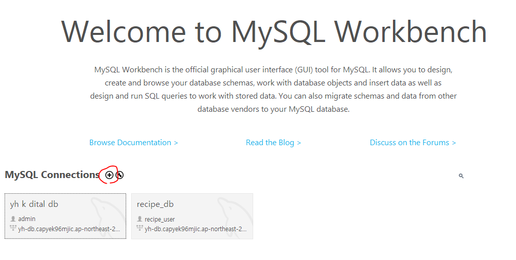 가상환경을 모두 만들면 다음으로는 mysql에서 데이터베이스를 새로 만든다. 이 데이터베이스는 본인만 들어갈수 있게 설정해야 한다. mysql 쿼리문으로 다음과 같이 써준다. 본인이 설정할 유저 이름과 비밀번호 데이터베이스이름이 있어야 한다. 써주고 명령문을 적용해야 한다. 만약 중간에 설정한 값이 생각이 나지 않는것을 대비해 설정한 값들을 정리해서 메모장에 붙어 넣는다. use mysql; create user 유저이름 @'%' identified by 비밀번호 ; grant all on 데이터베이스이름.* to 아까 설정한 유저이름@'%'; 그럼 이제 mysql 홈화면으로 나와서 +버튼을 누른다. 누른후 본인이 아까 설정한 값들을 집어넣는다. aws의 RDS서버 주소도 있어야 한다. 값을 다 넣었다면..