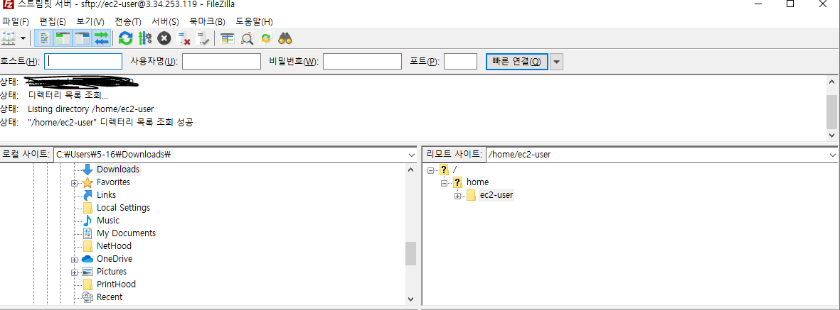 본인의 ec2서버와 연결된뒤 옆창에 서버의 파일이 보이게 된다. 이제 ec2-user 폴더로 들어가서 파일을 옮기거나 삭제하기 가 용이해진다.