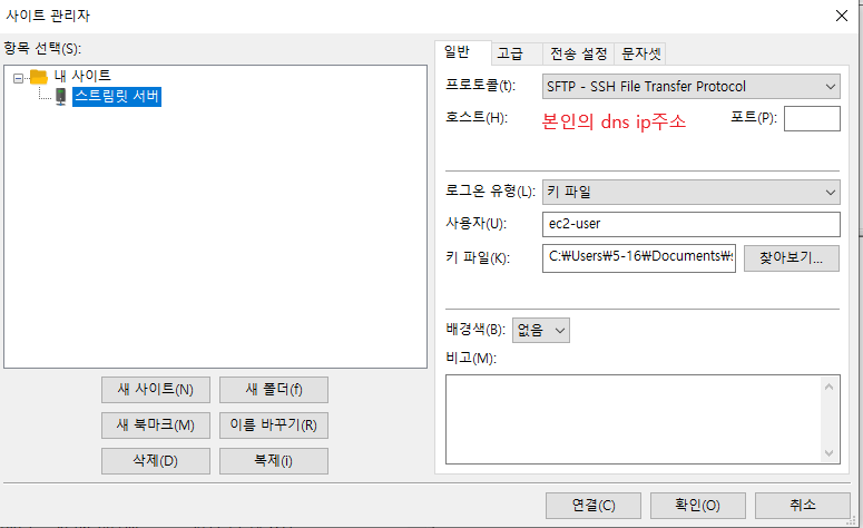그후 설정에서 서버 이름을 설정한뒤 putty처럼 프로토콜은 SFTP선택 호스트는 본인의 DNS ip 주소를 입력한뒤 사용자는 ec2-user라 쓰고 키파일은 aws에서 ec2서버를 만들때 다운 받은 pkl 키파일을 찾아보기를 통해 경로를 입력해준다.