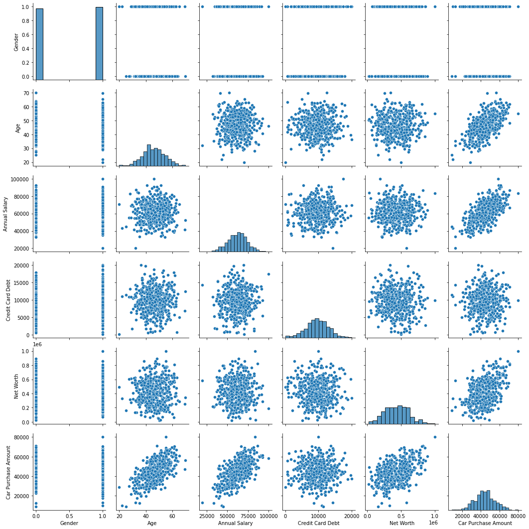 컬럼중 Gender,Age,Annual Salary,Credit Card Debt,Net Worth와 Car Purchase Amount 관계가 있다는걸 알수 있다.