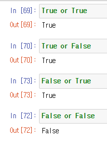 OR는 어느 조건이든 어느 한 조건만 참이라면 참(True)이 나오고 전부 거짓이여야 거짓(False)이 된다.