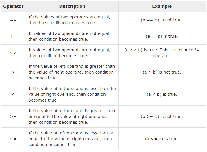 각 비교연산자의 기호는 다음 표에 정리 되어 있다.