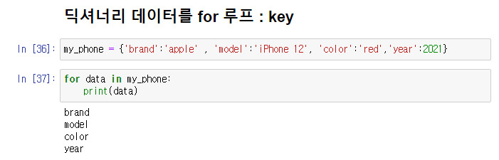 딕셔니리는 for문을 사용하면 기본적으로 키값을 사용한다.