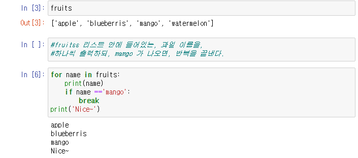 break는 if와 같은 조건문을 만족할때 break문을 실행한다. 또한 break문에서 실행이 끝나기 때문에