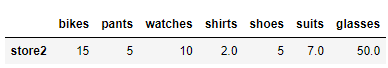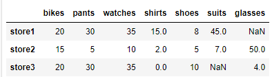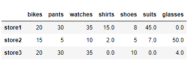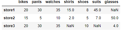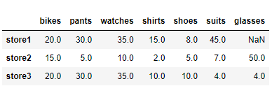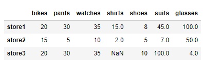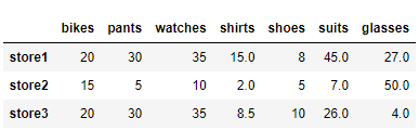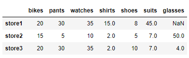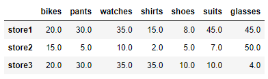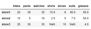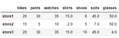 df=pd.DataFrame(data= items2,index = ['store1','store2','store3'])