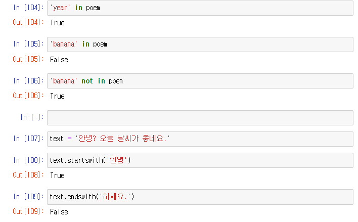 ' 찾는 문자열 in 변수 ' 의 형태를 이용하여 해당 변수에 찾는 문자열이 존재하는지 판별 Ture/False로