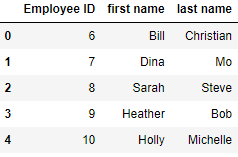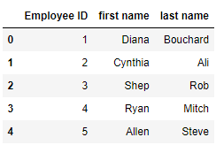 df_Engineering_dept = pd.DataFrame(raw_data, columns = ['Employee ID', 'first name', 'last name'])