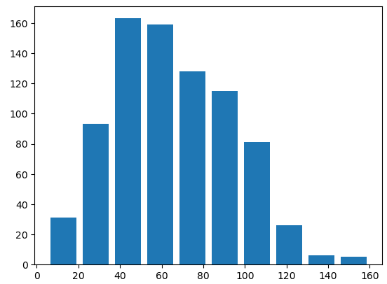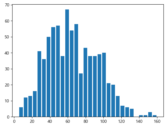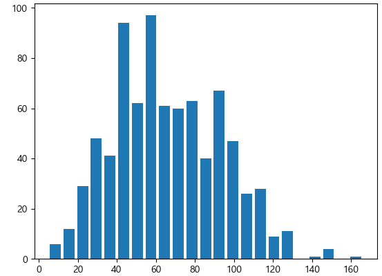 히스토그램은 구간을 설정하여, 해당 구군에 포함되는 데이터가 몇개인지 세는 차트를 히스토그램이라고 한다. 히스토그램의 가장 큰 특징은 bin(구간)을 자유롭게 설정이 가능하다는 점이다.