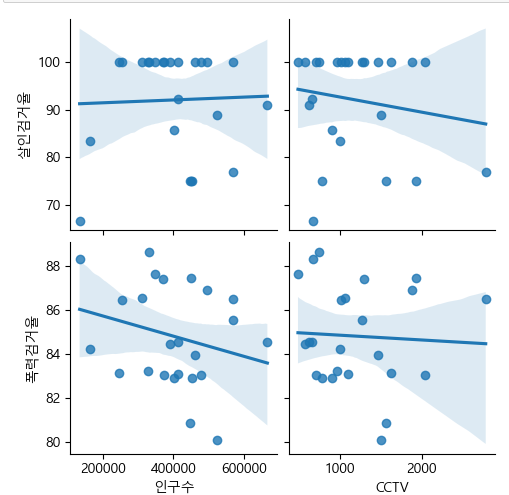 #산점도를 그리고 선을 나타낸다. x값엔 인구수,CCTV컬럼 y값엔 살인검거율,폭력검거율