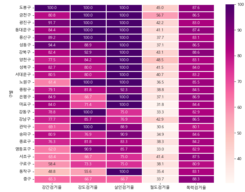 히트맵 결과 진한게 검거율이 좋은거고 도봉구가 가장 검거율이 좋은것을 시각적으로 알수있다.