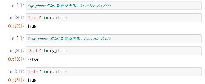 딕셔너리 연산 5. 딕셔너리 구조는 리스트 구조와 유사하게 in 함수로 데이터내에 특정한 함수가 있는지 판별