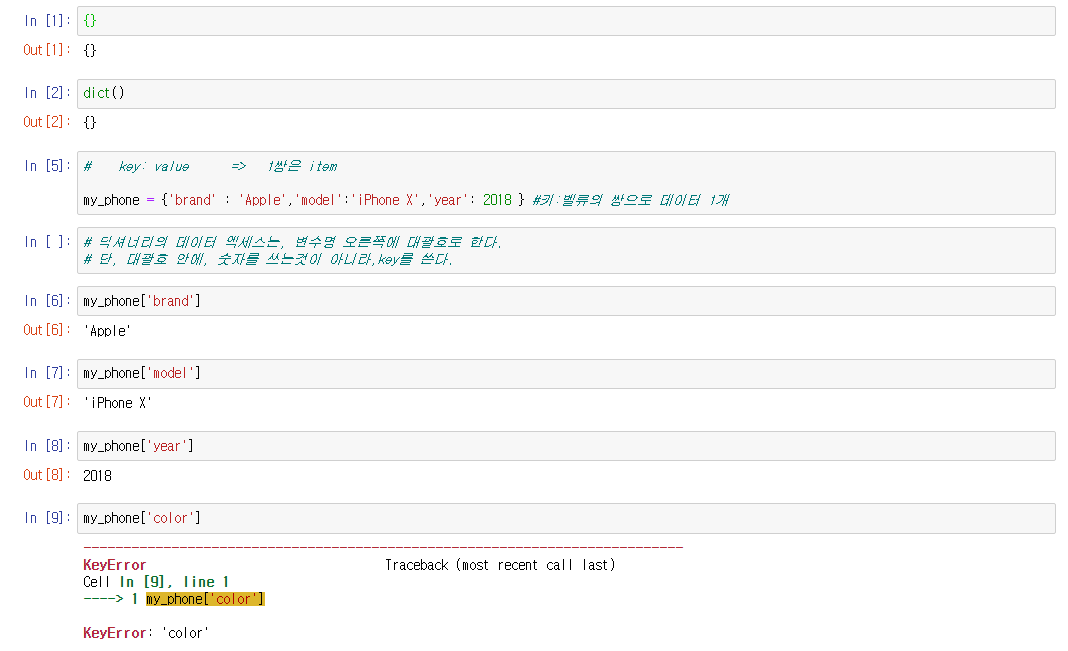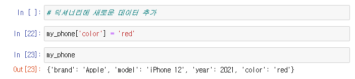 딕셔너리 연산 2. 딕셔너리 구조는 대괄호 기호로 키의 값을 입력하여 데이터를 벨류와 함께 추가 할수 있다.