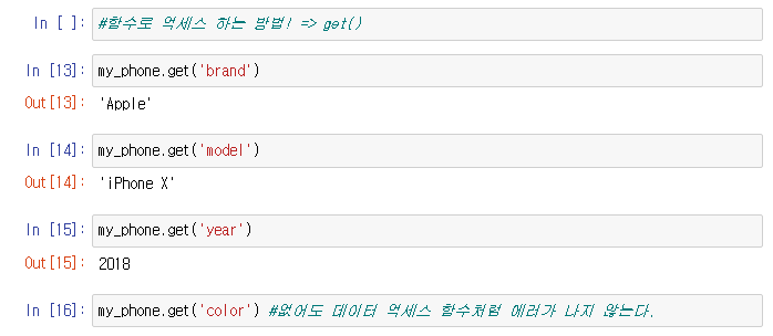 딕셔너리 연산 1. 딕셔너리 구조는 get함수로 억세스 한다. 다만 get()함수는 데이터가 딕셔너리 내에