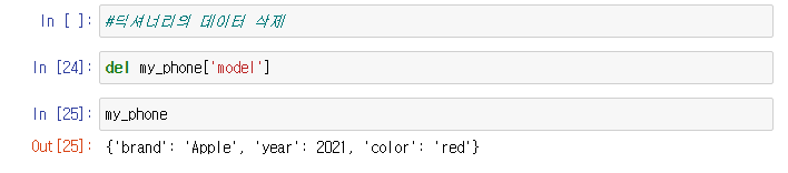 딕셔너리 연산 3. 딕셔너리 구조는 리스트 함수와 유사하게 del함수나 remove,pop 함수등을 사용할 수 있다.
