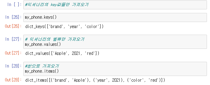 딕셔너리 연산 4. 딕셔너리 구조 데이터는 키값끼리 벨류값끼리 쌍으로 가져오기 같은 기능이 가능하다.