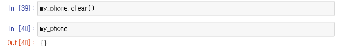 딕셔너리 7. 딕셔너리 구조 데이터는 clear함수로 한번에 전체 데이터를 삭제 가능하다.