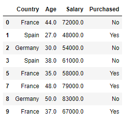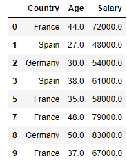 따라서 X는 Country,Age,Salary 컬럼의 데이터만 y는 Purchased 컬럼만 쓴다.
