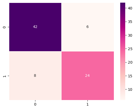 sb.heatmap(data=cm,annot= True, cmap='RdPu',linewidths= 0.7)