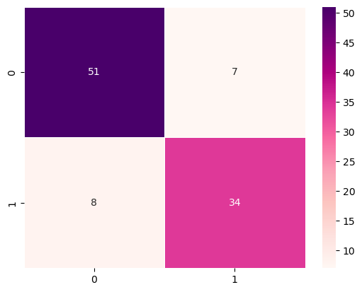 sb.heatmap(data=cm,annot= True, cmap='RdPu',linewidths= 0.7)