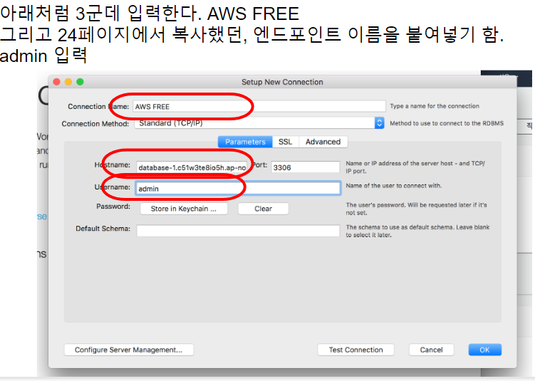 플러스에서 누르면 이렇게 화면이 나오고 여기에 connection name에서 아무이름이나 만들고(왠만하면 영어로) hostname에서 저번에 복사한 aws엔드포인트를 붙여넣기 해준다. username은 admin 그리고 password는 store in keychain누르면 입력란이 나온다. 저번에 데이터베이스를 만들때 쓴 비번을 입력하자