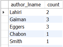 -- author_lname 별로 몇권의 책을 썼는지, 작가 이름과 책권수를 가져오시오.
