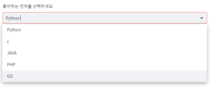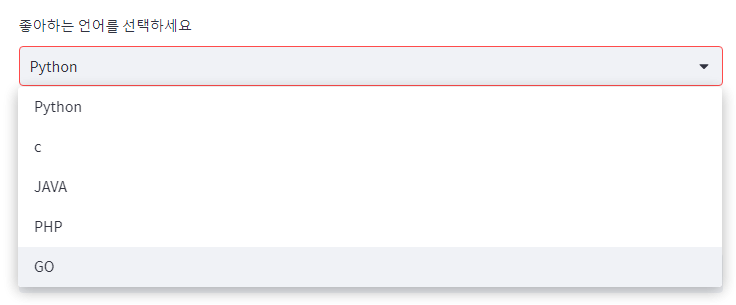 my_choice = st.selectbox('좋아하는 언어를 선택하세요',language)