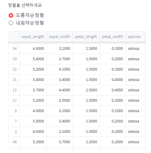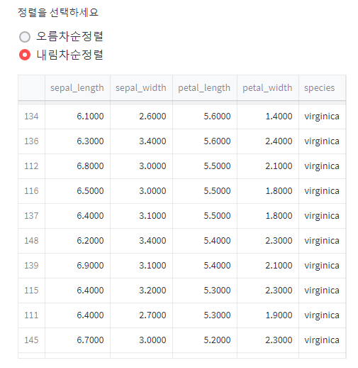 status =st.radio('정렬을 선택하세요',['오름차순정렬','내림차순정렬'])