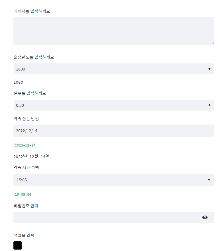 streamlit상에서 유저가 입력한 텍스트,날짜,숫자 등의 데이터를 받을수 있는 함수이다.