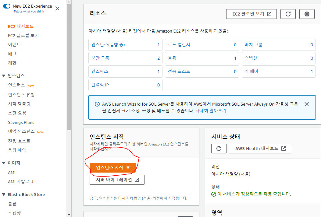 2. 클릭하면 ec2 대시보드가 화면이 나온다. 여기서 인스턴스 시작을 클릭한다.
