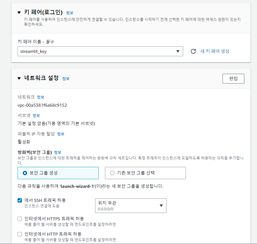 5. 새 키페어 생성을 누르고 서버의 키를 설정해준다. 매우 중요하니 절대 잊어버리지 말자(복사는 가능하다)