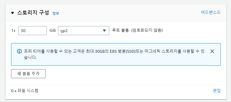 6.서버의 스토리지는 프리티어(무료)의 최대치를 설정해준다. 스토리지 용량이 적으면 금방 용량이 꽉찬다.