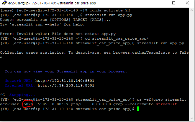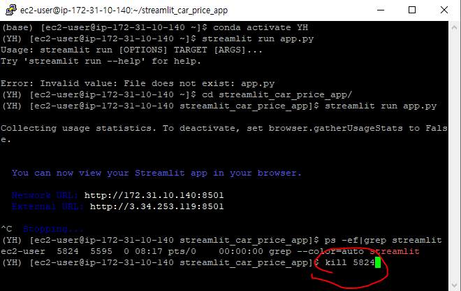 우선 ps -ef|grep streamlit를 실행한다. 여기서 동그라미 친 숫자를 찾는다 아마 사용자마다 번호가 다를것이다.